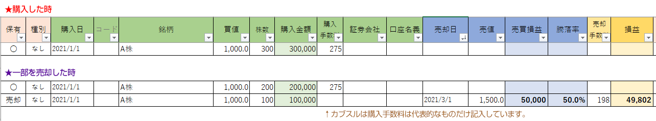 - 複製した情報の保有欄(A列)を売却に変更する。また、売却した株数(G列)を入力する
