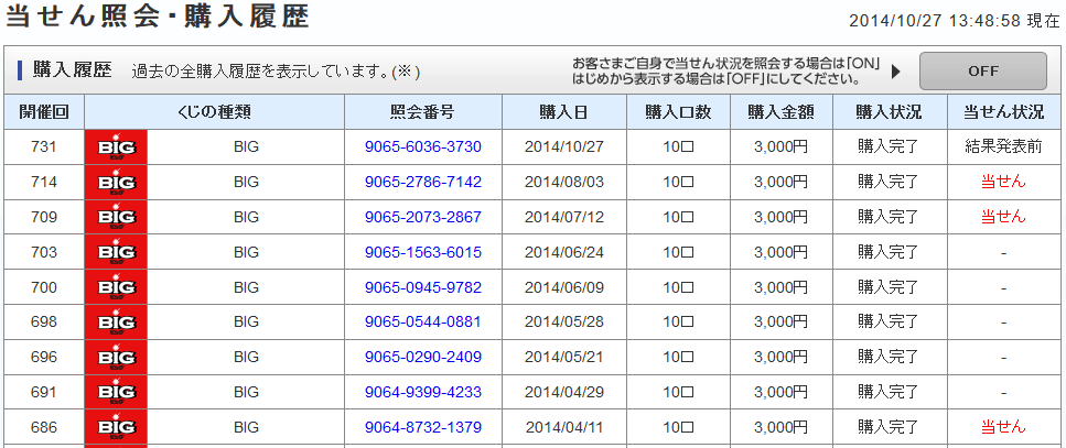 私は、サッカークジ(toto,BIG)の購入をたま~に 行っています。(toto 購入履歴 (小窓))