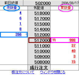 下記の画面だと、512,000円の株価に「買い」が988件集まっています。
